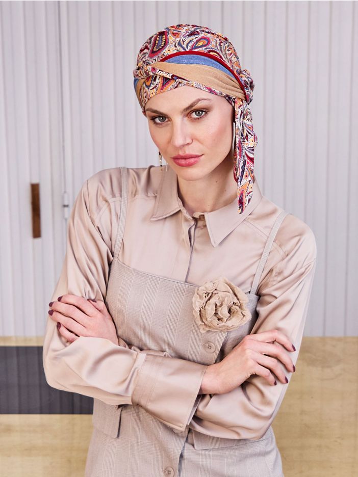 Tipp: Sie können Ihren HocBeatrice-Turban ganz bequem vor dem Aufsetzen binden und stylen.