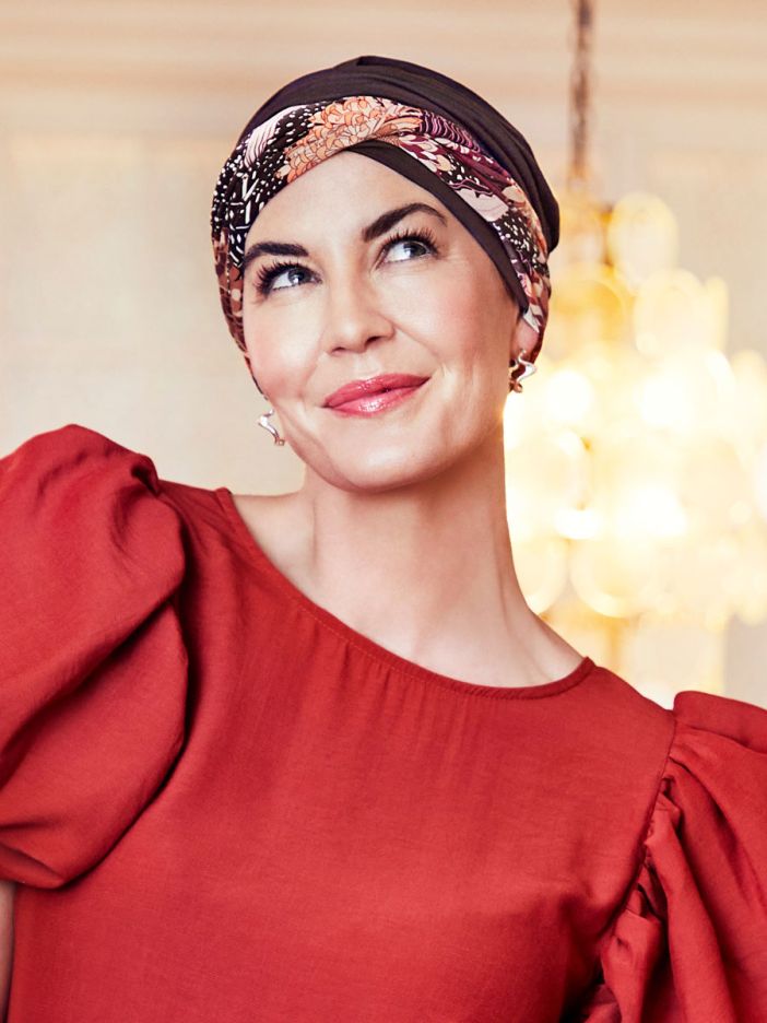 Der Turban ist in einem schönen dunkelbraunen Farbton gehalten und hat das schöne "Garden Pink" auf dem Stirnband. Der Aufdruck ist eine Mischung aus all den schönen Blumen, die wir aus dem spätsommerlichen Garten kennen, in den Farben orange, weiß und rosa - es ist, als würde man auf den schönsten Herbststrauß schauen.
