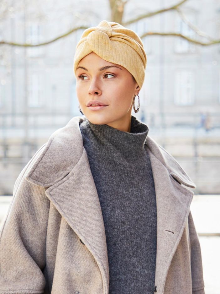 Der Turban Lilly ist eine spannende und einzigartige Erweiterung der Viva-Kollektion. Es ist ein eng anliegendes Modell mit einem kleinen Dutt vorne. Der Dutt schafft ein tolles Volumen und lässt sich nach beiden Seiten hin verschieben. Der Stoff ist weich, bequem und eignet sich perfekt für einen lässigen Streetstyle-Look, der aktuell sehr angesagt ist. Das Futter des Turbans ist aus einer weichen Baumwoll-Viskose-Mischung. Diese Version des Lilly-Turbans ist in der Farbe Soft Yellow gehalten, einem schönen Pastellgelb, welches einen schönen Kontrast zu allen klassischen Farben wie Schwarz, Blau und Grau setzt.