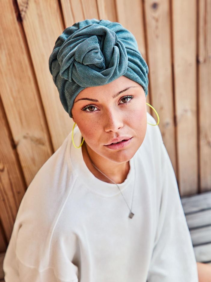 Hier ist der Turban in der eleganten Farbvariante Petrol zu sehen.