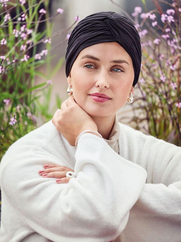 Vorne ziert ein fixierter, gedrehter Knoten den Turban und verleiht ihm genau das richtige Maß an Volumen. Dabei entsteht eine sanfte V-Form oberhalb der Augenbraue – ein schöner Blickfang, der das Gesicht elegant umrahmt. HocJoyo ist so gestaltet, dass das Volumen sich rund um den gesamten Hinterkopf fortsetzt.