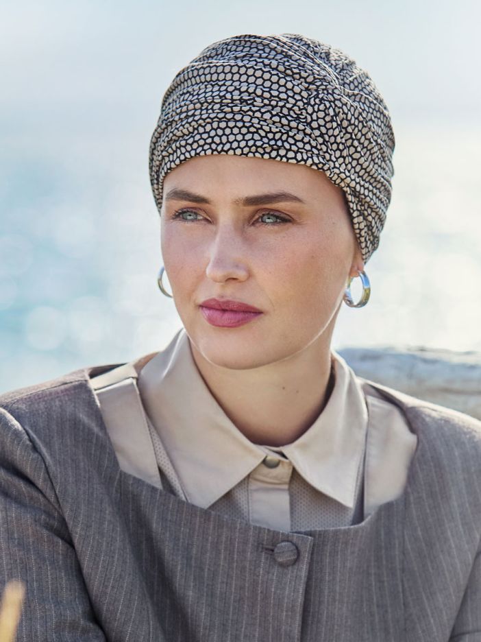 HocJoyo ist ein einzigartiges Modell mit einer besonderen Konstruktion, die Eleganz und Funktionalität perfekt verbindet. Das Modell besteht aus einer schlichten, eng anliegenden Basis mit vielen feinen Falten, die für einen schönen und angenehmen Sitz sorgen. Eine fest angebrachte, gedrehte Knotenverzierung an der Vorderseite verleiht zusätzliches Volumen an der Stirn und bildet eine sanfte V-Form oberhalb einer Augenbraue.