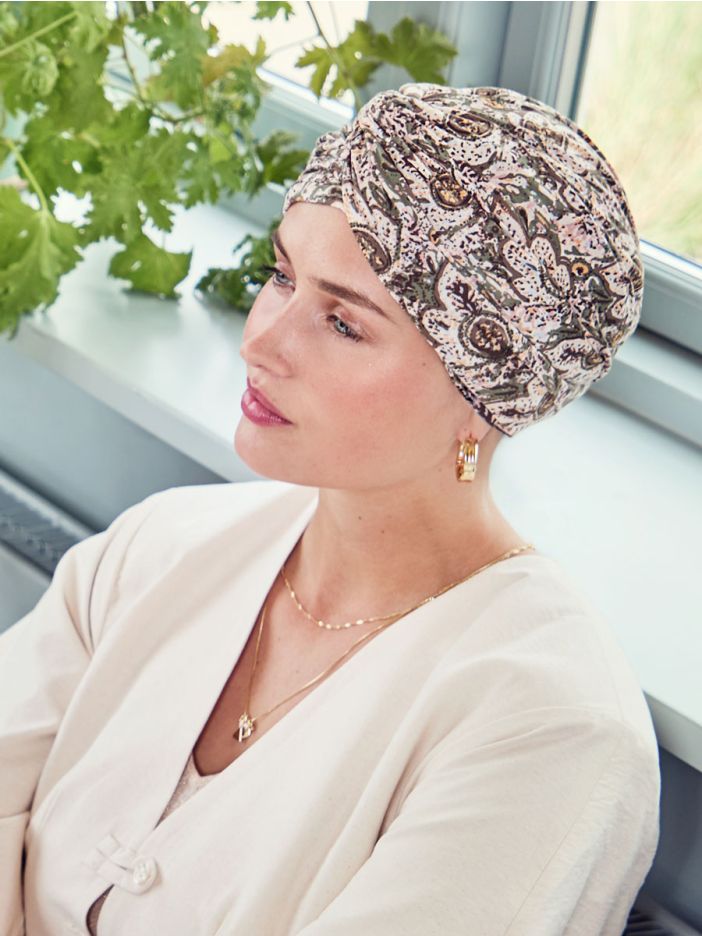 HocJoyo ist ein einzigartiges Modell mit einer besonderen Konstruktion, die Eleganz und Funktionalität miteinander verbindet. Die Basis ist schlicht, eng anliegend und mit vielen feinen Falten versehen, sodass der Turban angenehm und schön sitzt. Eine fest integrierte, gedrehte Knotenverzierung an der Vorderseite sorgt für perfektes Volumen an der Stirn und formt eine sanfte V-Linie über einer Augenbraue.