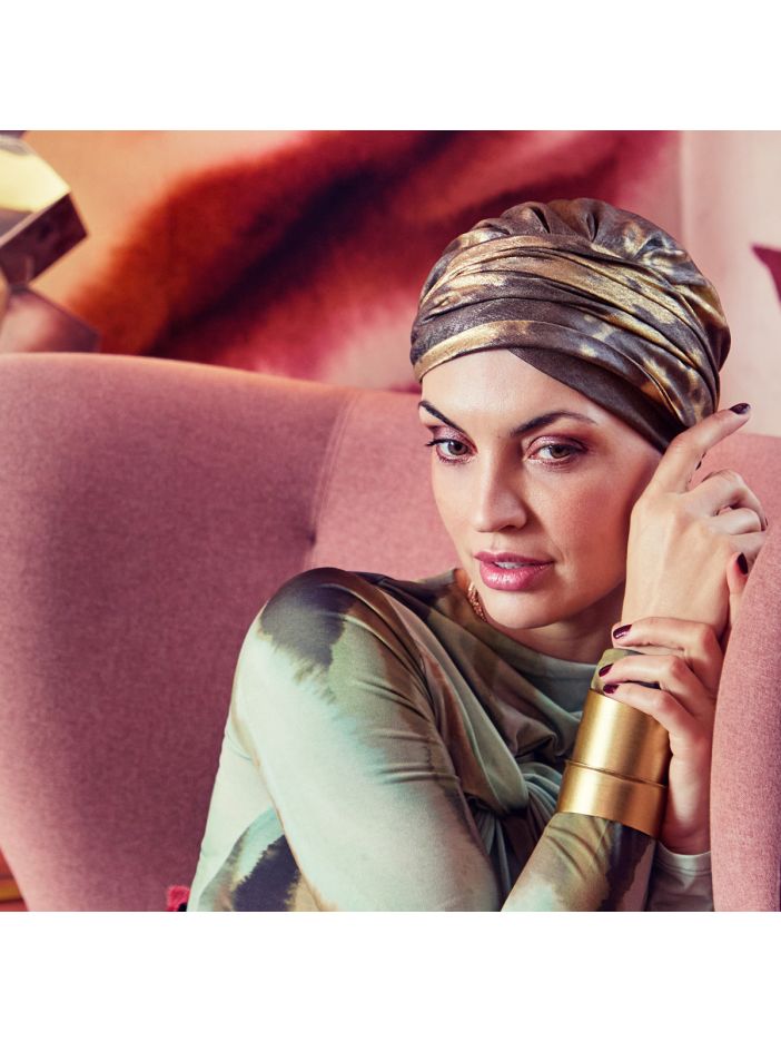 Verschwommene Aquarellspritzer in warmem Braun verschmelzen mit glänzendem Gold auf einem feinen Satinmaterial – es klingt fast zu schön, um wahr zu sein. Doch genau das macht diesen HocSapphire-Turban so besonders: ein Modell, das man immer wieder tragen möchte. Die erdigen Töne und das zurückhaltende Gold schaffen ein Design, das die Herbstgarderobe auf elegante Weise bereichert – dort, wo Raffinesse auf feminine Kopfbedeckung trifft.