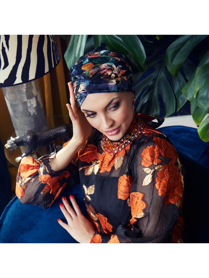 Die Basis in einem glänzenden Karamell-Gold-Mix ist leicht und angenehm zu tragen. Vorne hat der Turban drei Lagen, die dem Stirnband Halt geben und verhindern, dass es verrutscht. Ein schönes Detail ist das zusätzliche Band am Rande, das rund um den Turban geführt ist. Es sorgt für besseren und sicheren Halt auf der Kopfhaut.